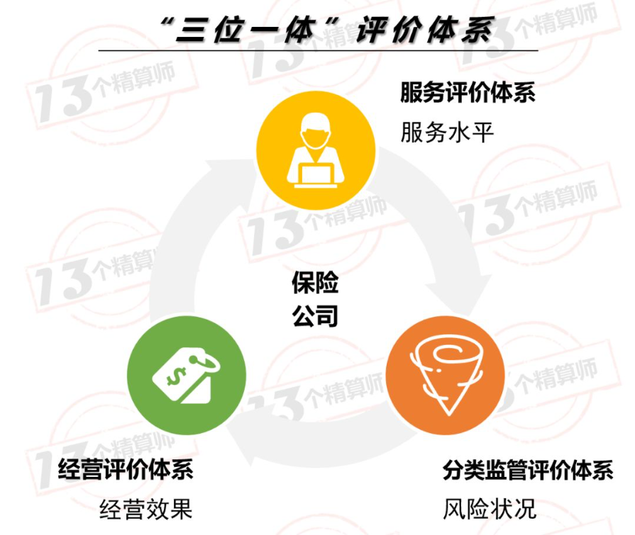 最后,提一下前文说到的“三位一体”评价体系,简单的说,就是囊括了监管对险企经营、风险、服务三方面的评价结果。