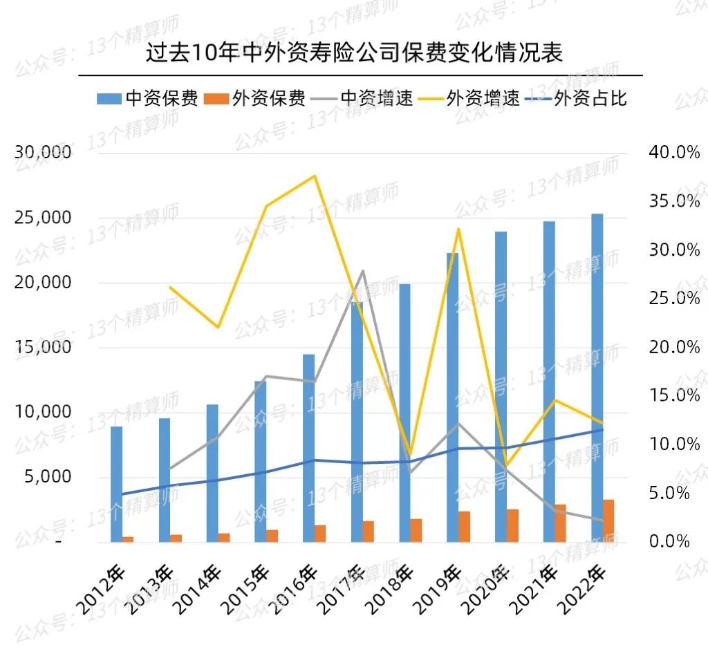 在我们统计的71家寿险公司中,中资寿险公司45家,外资寿险公司26家。2022年,26家外资寿险公司的原保费收入为3313亿元,保费占比提升了近一个百分点,达到了11.6%,保费增速12.3%,超过了中资公司10个百分点。